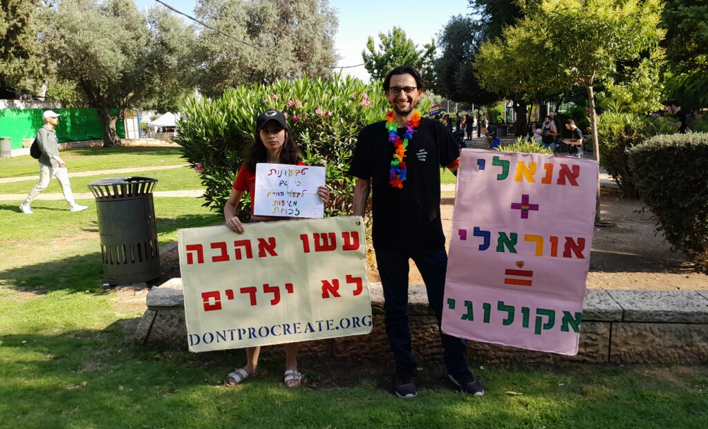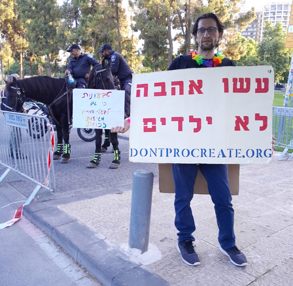 As in the pride parades in Tel Aviv, Haifa, Rehovot, Hamburg, Frankfurt, Leipzig and London, in Jerusalem the antinatalist messages were received with openness, support and humor. Many took pictures, many took pictures of themselves holding the signs, others smiled, laughed, supported, and although such events are usually not the ideal set for discussions, there were also some good conversations. There was even a short interview with two American journalists who came to cover Pride and the antinatalist message interested them so they talked to me.