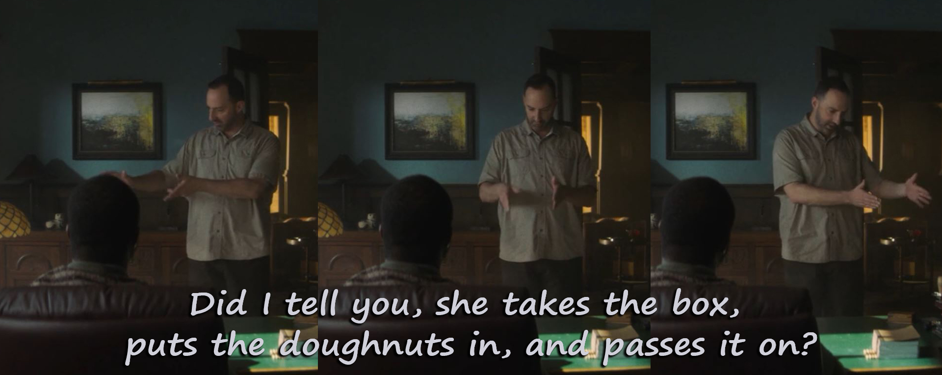 Did I tell you, she takes the box, puts the doughnuts in, and passes it on?”