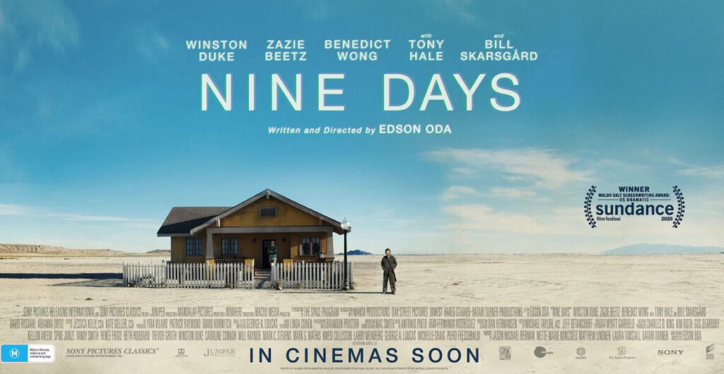 The film “Nine Days” follows the nine-day process of choosing one soul from a number of candidates to be “granted” life. The process is revealed to us through the work of a “soul arbiter” named Will. Will spends his time watching the lives of the souls he has chosen, from their perspective, on television screens, and he takes notes and files them.